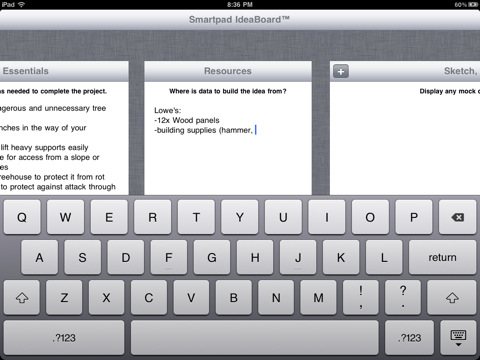 This is a great little app for creating idea boards. It has the ability to use labels or notes to record ideas as they happen. It incorporates to do lists and can import contacts from your address book. It also allows the user to paste up photos on an ever-increasing board to records your whole thought process. The app also allow for pinch zooming in order to go back and check the details of all those ideas.